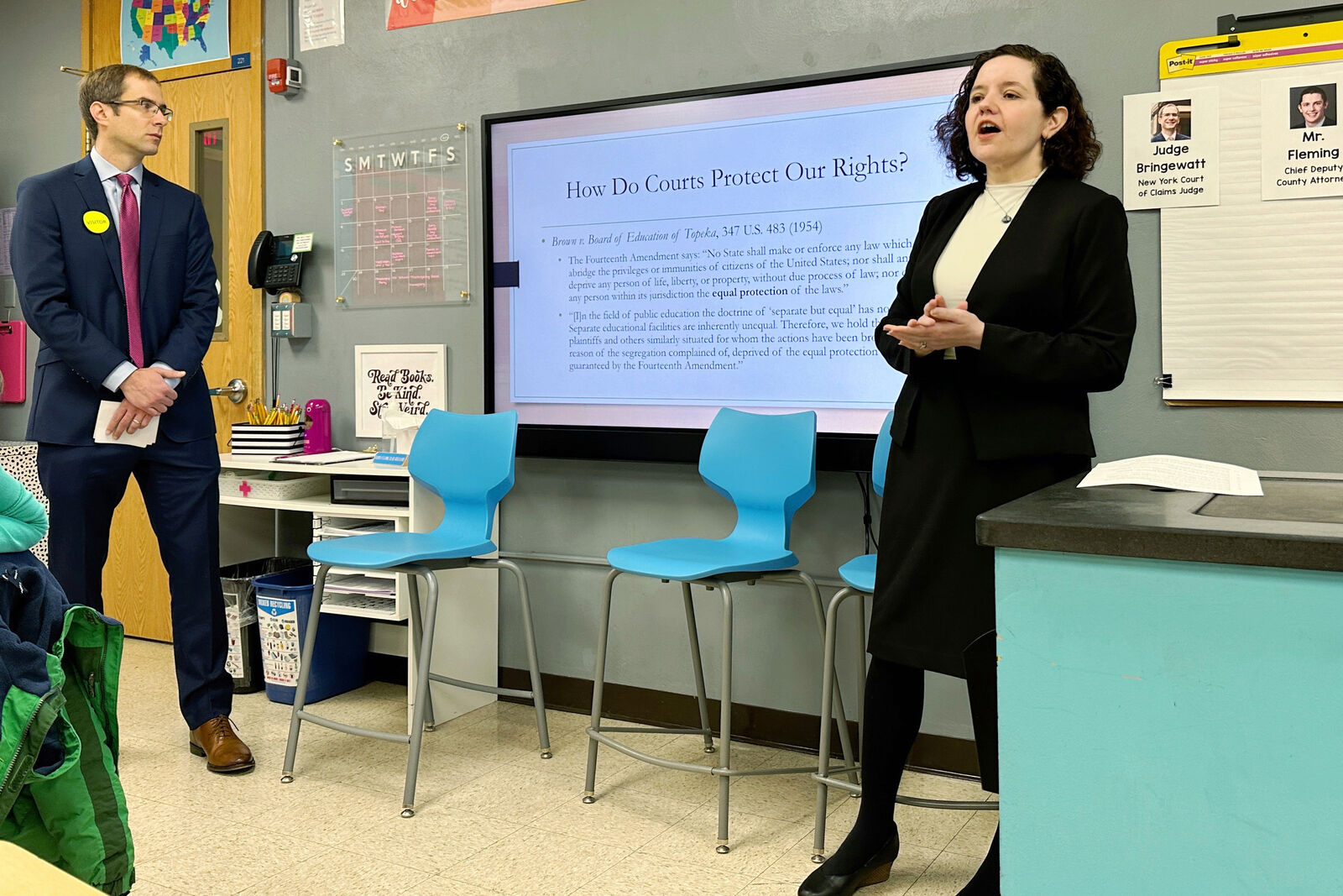 French Road Elementary School fifth graders learned about government from three of their class’s parents. New York Court of Claims Judge John Bringewatt, United States Magistrate Judge Colleen Holl...